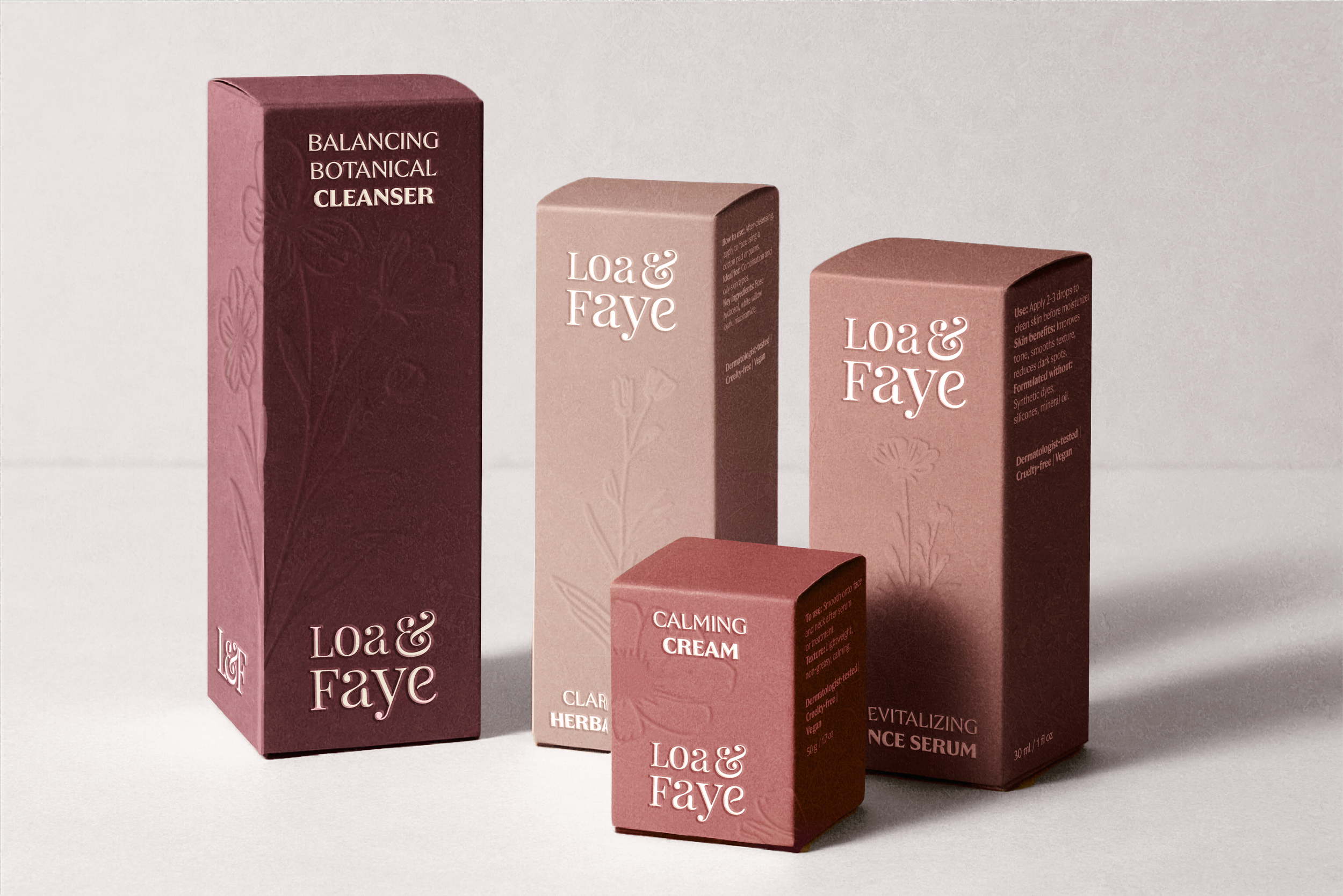 To develop a cohesive brand identity for Loa & Faye Skincare that communicates a sense of elegance and self-care through refined typography, a soft color palette, and thoughtful packaging design. The project includes logo development, packaging for bottles and boxes, billboard advertising, and store signage to establish a consistent and recognizable brand presence.